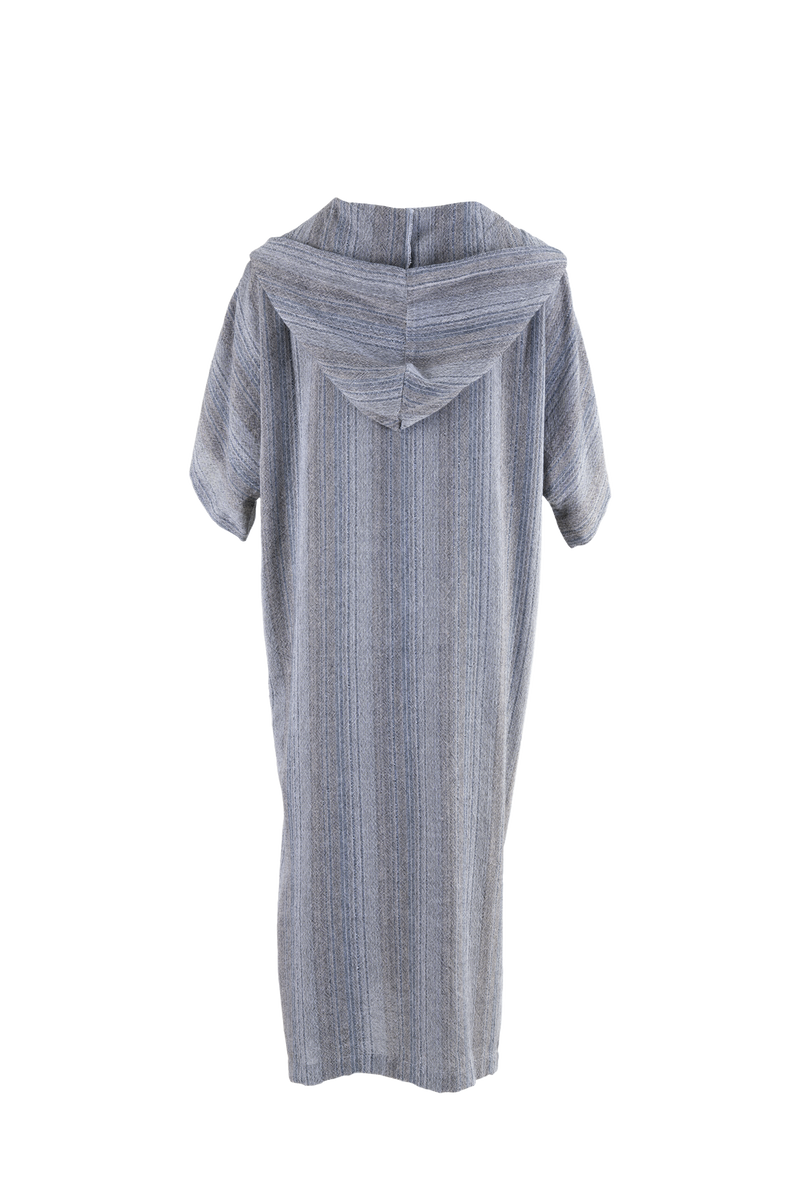 Ares, the longline hand frayed kaftan with side slits and a hood.