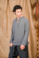 Heros, the lace up collar top. Made with a very delicate handwoven linen fabric, the relaxed fit top can be paired casually with our Philio or Simbad pants.