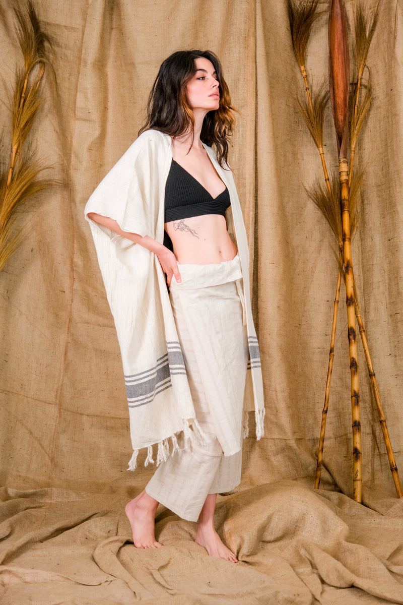 Sensei, the timeless handwoven kimono with fringed hem. Wear it from day to night, whilst having a sunset drink or a chill day by the beach. Should you choose to wear it as a beach cover up, the cotton heavy, handwoven light-weight fabric is highly absorbent and dries quickly.